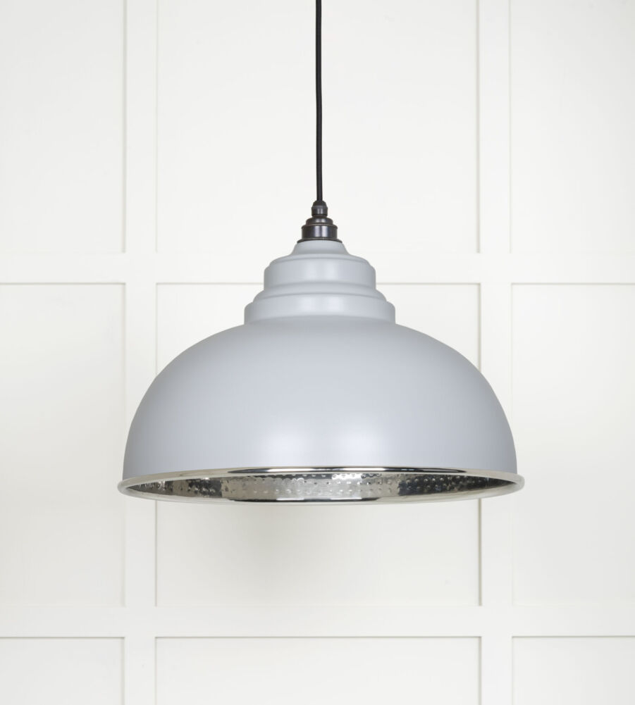 From The Anvil Hammered Nickel Harborne Pendant in Birch£449.30 inc VAT Diameter: 400mm Height: 270mm Rose Diameter: 120mm Weight: 2.2kg Fitting: E27 Bulb: LED Only – 6W Maximum (purchased separately) NOTE: This product is only available for online delivery and not for pick up from our trade counter Refresh Captcha From The Anvil Hammered Nickel Harborne Pendant in Birch quantity Add to cart SKU: 45472BI Categories: All Shapes, Lighting, All Harborne Pendants, All Hammered Pendants, Hammered Nickel Description Additional information Description The Harborne pendant embodies classic British design. It’s rounded edges and satisfying proportions make it the focal point in any room. Our pendants are all made to order on a 3-4 week lead time. Light fittings are dimmable as long as a dimmable LED bulb is fitted. Supplied fully wired with matching ceiling rose and all necessary fixings. 1.5m of black fabric cable as standard. Please avoid using any form of chemical cleaner on our pendants. We recommend lightly buffing with a dry cloth so as not to damage the finish. Our pendants are available in a wide choice of finishes and colours. We also offer bespoke colours. Please contact us for further information. Our Hammered Nickel pendants are spun from solid brass and plated in nickel. When lit the hammered interior glistens whilst emitting a soft dappled light. Additional information Color Hammered Nickel Manufacturer From The Anvil Unit of Sale Each Related products From The Anvil Hammered Nickel Harborne Pendant in Slate £449.30 inc VAT Add to cart From The Anvil Hammered Nickel Harborne Pendant in Soot £449.30 inc VAT Add to cart From The Anvil Hammered Nickel Harborne Pendant in Heath £449.30 inc VAT Add to cart From The Anvil Hammered Nickel Harborne Pendant in Flock £449.30 inc VAT Add to cart From The Anvil Hammered Nickel Harborne Pendant in Elan Black £449.30 inc VAT Add to cart