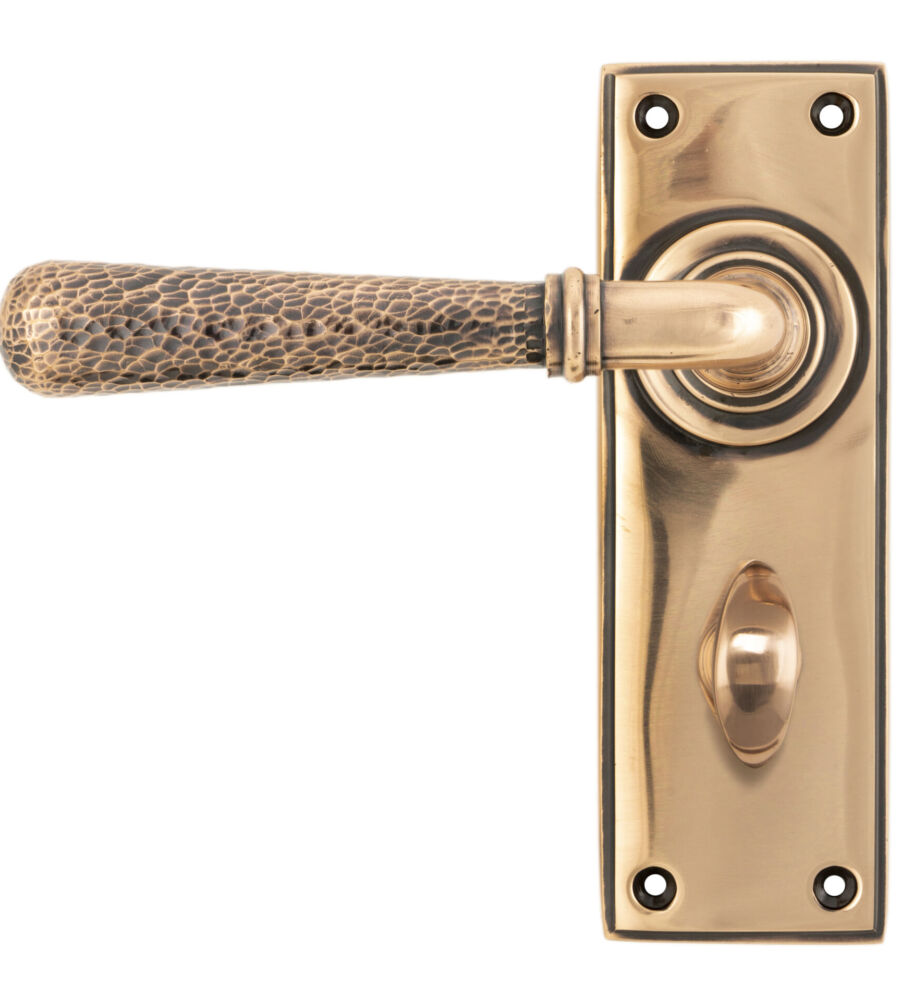 From The Anvil Polished Bronze Hammered Newbury Lever Bathroom Set£294.36 inc VAT Backplate Size: 152mm x 50mm x 8mm Handle Length: 124mm Centres: 57mm NOTE: This product is only available for online delivery and not for pick up from our trade counter Refresh Captcha From The Anvil Polished Bronze Hammered Newbury Lever Bathroom Set quantity Add to cart SKU: 46227 Categories: Hammered Range, All New, All Lever Handles, Hammered Newbury Range, All Door Furniture, Lever Handles Description Additional information Description Our hammered range of products are meticulously hand-hammered by our skilled craftsmen. The textured surface this creates is well suited to a wide variety of settings. Our weighty hammered newbury lever handle range is forged from solid bronze which emphasises the high quality materials and manufacturing techniques used. A perfect design choice to use throughout your property with many other matching products available. This handle has a strong spring incorporated into the stylish boss design to give both functionality & elegance. Lever handle for internal doors where privacy is required. Set includes 2 lever bathroom handles and coin and release thumbturn. Can be used with a bathroom mortice lock. Supplied with matching SS wood screws. Manufactured from solid bronze containing a minimum of 85% copper, this finish can be described as a ‘living finish’ that adapts to its surroundings. This finish is firstly aged and then re-polished, which creates a subtle contrast between the lighter surface areas and the darker detailed areas of each product. A perfect choice for both contemporary and traditional settings. Additional information Color Polished Bronze Manufacturer From The Anvil Unit of Sale Set Related products From The Anvil External Beeswax Avon Round Lever on Rose Set (Square) £162.28 inc VAT Add to cart From The Anvil Pewter Avon Round Lever on Rose Set (Beehive) £154.57 inc VAT Add to cart From The Anvil Pewter Avon Round Lever on Rose Set (Square) £162.28 inc VAT Add to cart From The Anvil Pewter Avon Round Lever on Rose Set (Plain) £154.57 inc VAT Add to cart From The Anvil Pewter Avon Round Lever on Rose Set (Art Deco) £154.57 inc VAT Add to cart