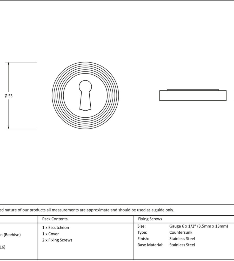 From The Anvil Satin Marine SS (316) Round Escutcheon (Beehive)£69.80 inc VAT Finish: Satin Marine SS (316) Type: Escutcheons Range: Beehive Range: Diameter: 53mm Thickness: 8mm NOTE: This product is only available for online delivery and not for pick up from our trade counter Refresh Captcha From The Anvil Satin Marine SS (316) Round Escutcheon (Beehive) quantity Add to cart SKU: 49866 Categories: All Door Furniture, Escutcheons, Pulls & Thumbturns Description Additional information Description Our vast range of escutcheons are designed as a finishing touch for all locking doors and are used to decorate key holes. Our Satin Marine Stainless Steel is grade 316 and manufactured with high concentrations of chromium and nickel. These products offer great strength and have extremely resilient corrosion resistant properties which make them an excellent choice for coastal locations. This finish is low sheen and offers a frosted, matt look. For complementary products, we recommend our Satin Chrome finish. Additional information Color Satin Marine SS (316) Manufacturer From The Anvil Unit of Sale Each Related products From The Anvil Black Regency Lever on Rose Set (Square) £149.28 inc VAT Add to cart From The Anvil External Beeswax Regency Lever on Rose Set (Beehive) £154.57 inc VAT Add to cart From The Anvil External Beeswax Regency Lever on Rose Set (Plain) £154.57 inc VAT Add to cart From The Anvil External Beeswax Regency Lever on Rose Set (Art Deco) £154.57 inc VAT Add to cart From The Anvil External Beeswax Regency Lever on Rose Set (Square) £162.28 inc VAT Add to cart